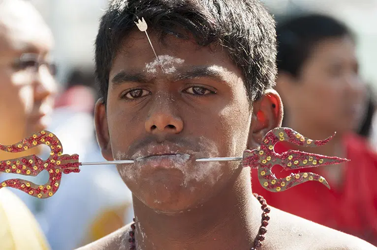 In most cases, only kavadi bearers will get their skin pierced to support the weight of the ceremonial sacrifice. This act of reverence to Lord Murugan is in addition to the 48 days of prep that kavadi bearers have to observe, which includes a strict vegetarian diet, and abstinence from all sorts of luxury and desire.